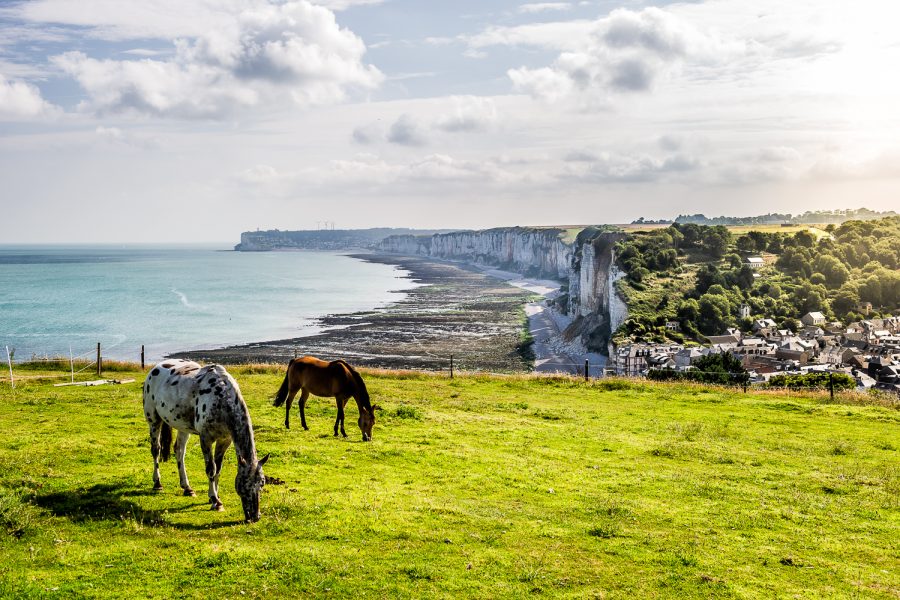 Fotografia de paisaje con caballos pastando en los acantilados de Yport, Normadia (Francia).