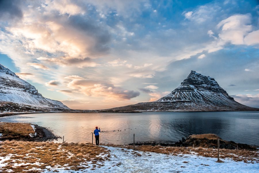 Atardecer en la montaña Kirkjufell cerca de Grundarfjörður, peninsula de Snæfellsnes (region de Vesturland, Islandia)