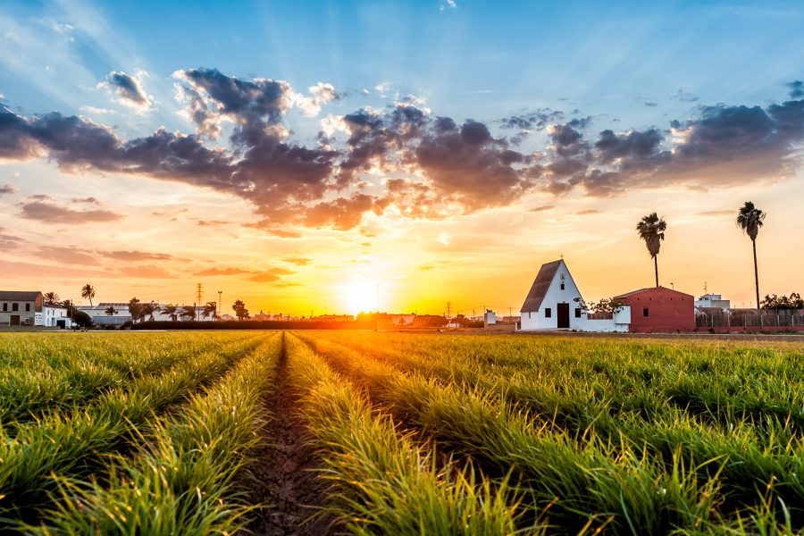 Vista de la alquería valenciana en el paisaje valenciano típico de l’Horta Nord en Alboraya, Valencia.