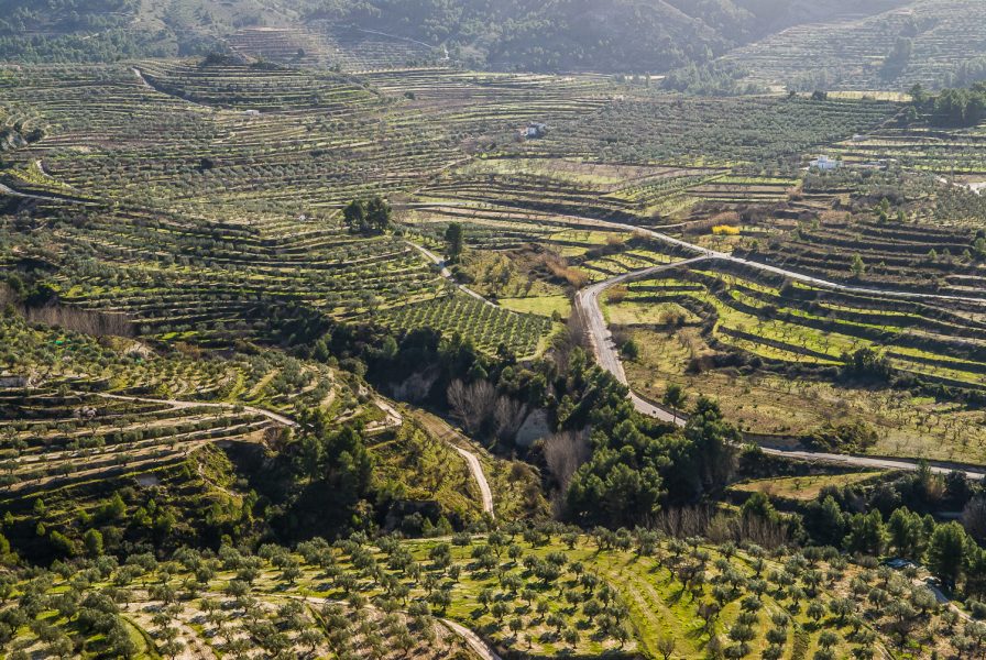 Bancales de almendros y olivos en Planes, provincia de Alicante.