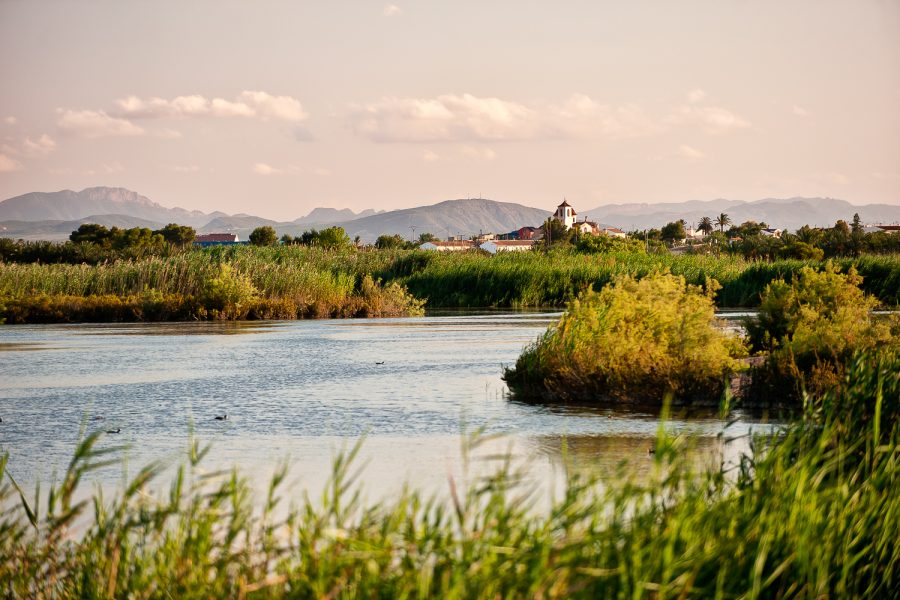 Vista del pueblo de San Felipe Neri en el Parque natural del Hondo de Elx, provincia de Alicante.